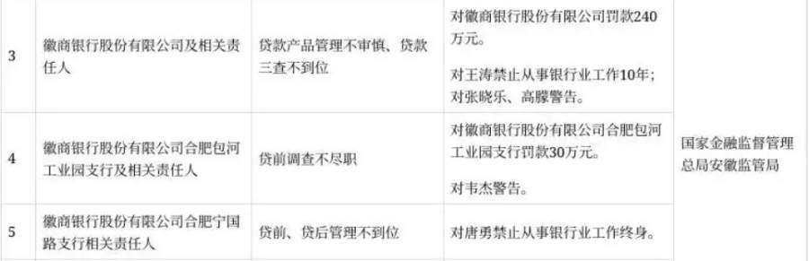 10月26日,徽商银行因贷款产品管理不审慎、三查不到位被处以240万元罚款,相关责任人王涛被禁止从事银行业工作10年;合肥包河工业园支行因贷前调查不尽职被罚30万元,相关负责人唐勇被禁止从事银行业工作终身。