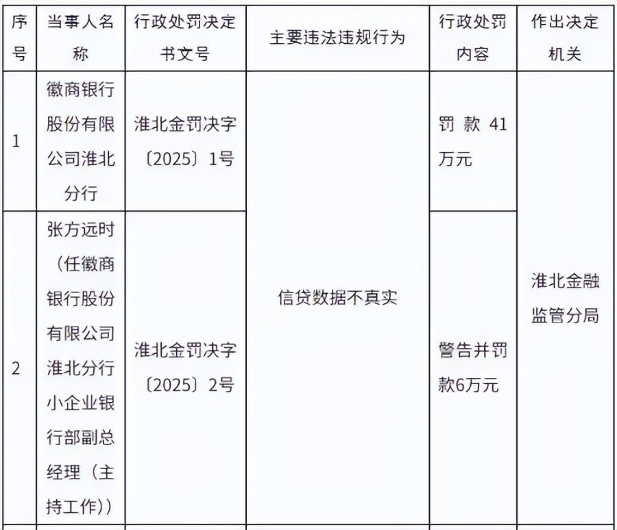 另据国家金融监督管理总局淮北监管分局在5月14日披露的行政处罚信息,徽商银行淮北分行因信贷数据不真实,被淮北金融监管分局处以罚款41万元,时任淮北分行小企业银行部副总经理(主持工作)的张方远也被罚款6万元。