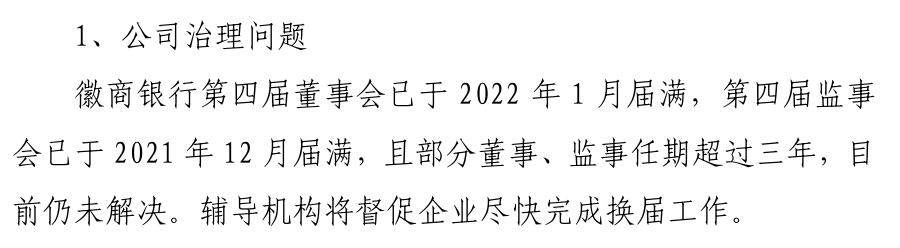 报告指出,徽商银行第四届董事会已于2022年1月任期届满,监事会任期则在2021年12月结束,部分董事、监事任期已超三年却迟迟未完成换届;同时存在单一职工持股超过50万股的情形。