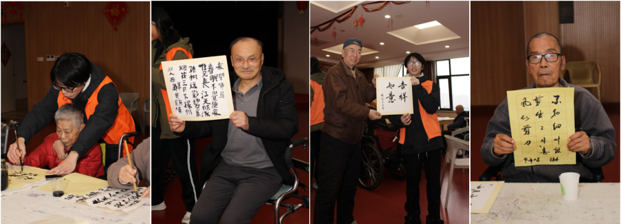 与手工区的热闹相映成趣,书法活动区则是一片宁静雅致、墨香四溢的景象。爱好书法的志愿者们与老人们一同铺开宣纸,研墨挥毫。志愿者们虽显笔法稚嫩,但态度极为认真;老人们则宝刀未老,下笔沉稳有力。他们共同书写下“吉祥如意”、“福寿安康”、“平安喜乐”等饱含美好祝愿的词语。一笔一划之间,流淌的是对传统文化的传承,更是两代人之间无声的交流与共鸣。一位热爱书法的爷爷在看到一位同学写的“寿”字后,还亲自上前指导,讲解运笔的力道与结构布局。这一刻,教学相长,敬老与求学完美融合,构成了一幅动人的画面。