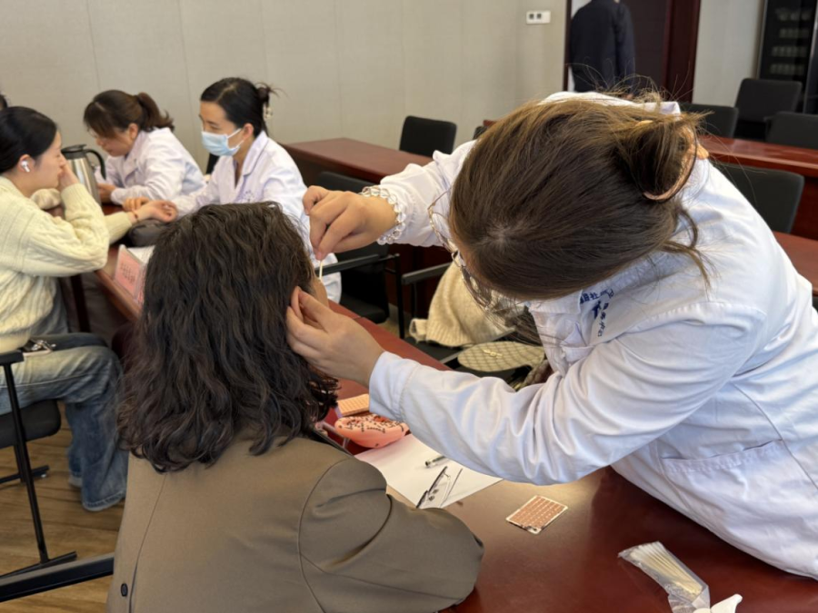 “长期对着电脑写材料,颈椎疼得抬不起来,听说有中医义诊,就来试试针灸!”一位职工来到针灸诊位前,来自圃田卫生院的刘素霞大夫根据前来问诊的职工情况,仔细为他触诊颈椎,随即选取风池、天柱、大椎等穴位进行针灸治疗。“最近失眠有点严重,听说贴耳穴能助眠,我来试试!”一位职工坐在耳穴压豆诊位前说道,来自吉瑞路社区卫生服务中心的陈艳大夫先为职工做中医体质辨识,确定为“肝郁脾虚型”失眠后,用酒精棉片仔细清洁职工耳廓,精准找准穴位贴上耳穴贴,还手把手示范按压手法:“每次按1分钟,每天3-4次,按到有酸胀感就可以,别用力抠拽,避免损伤皮肤。”