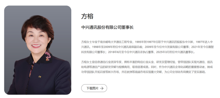 官网介绍,方榕是信息通信行业资深专家,拥有丰富的电信行业从业、研发及管理经验,曾带领团队实现光通信、视讯和电源等通信产品的研发突破与规模商用,取得显著成果。同时,作为中兴通讯全球化战略的重要推动者,她成功带领团队开拓印度等新兴市场,并在欧洲等高端市场实现重大突破,为公司全球化布局奠定了坚实基础。