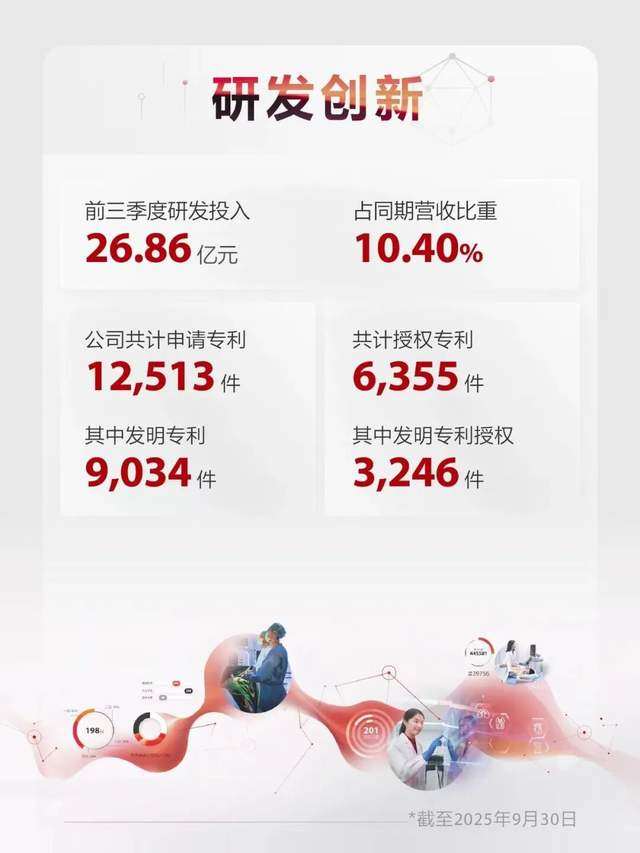 根据三季报披露,迈瑞医疗2025年前三季度继续保持高研发投入,金额26.86亿元,占营业收入比重10.40%,占比同比提高。截至三季度末,公司累计申请专利12513件,其中发明专利9034件;共计授权专利6355件,其中发明专利授权3246件,授权专利总数较上年同期增长792件。