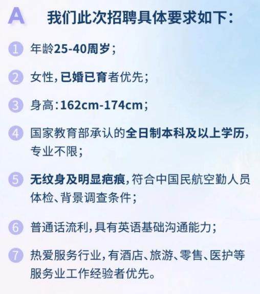 雷达财经了解到,春秋航空“空嫂”的招聘条件包括:年龄需在25-40岁之间;优先考虑已婚已育的女性;身高要求在162-174cm;学历方面需达到本科及以上,但不设专业限制。