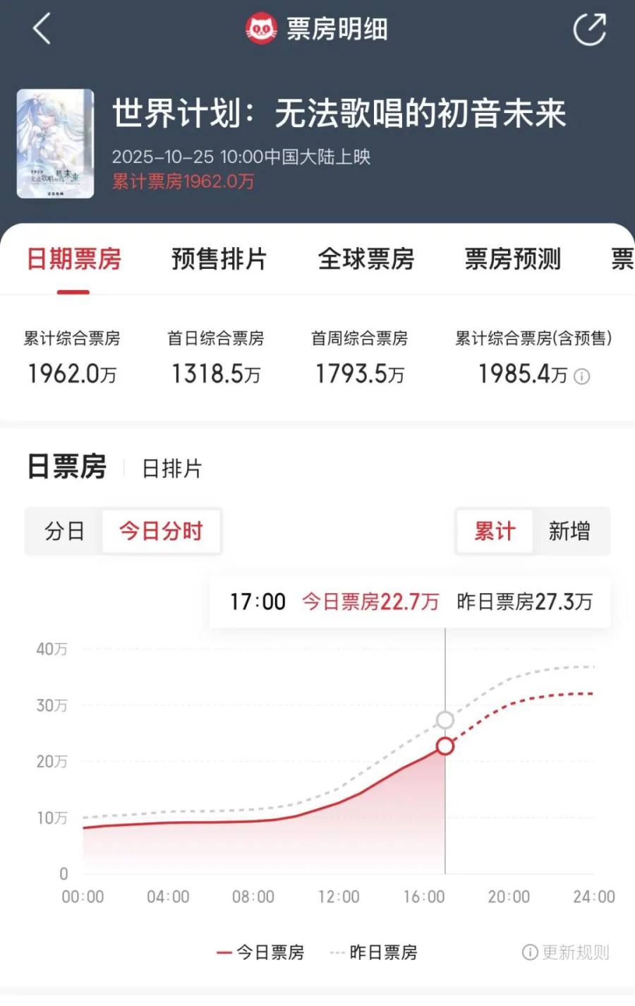 然而,当演唱会的光环褪去,这位超级数字偶像的IP生命力正面临严峻考验。其首部大电影《世界计划:无法歌唱的初音未来》上映5天,票房止步于1962万,市场反响未达预期。