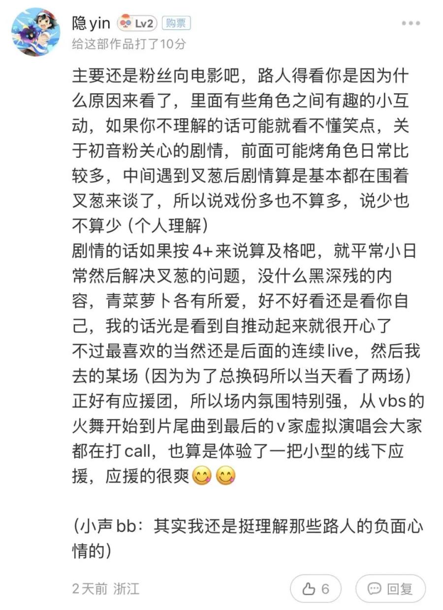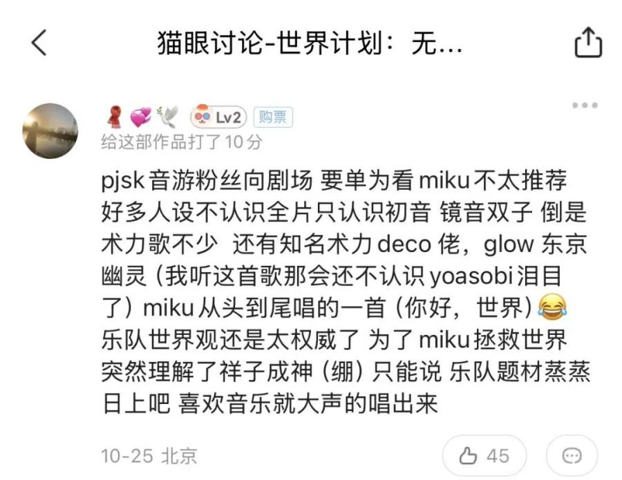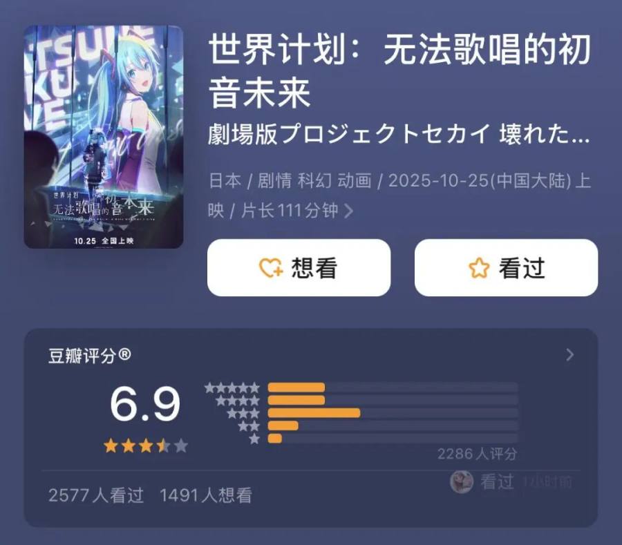此次《世界计划:无法歌唱的初音未来》大电影,整体反响平淡,未能跳出核心粉丝圈层,更像是一场圈内自嗨。影片上映至今票房未破两千万,网络评价也褒贬不一,整体风评不高。