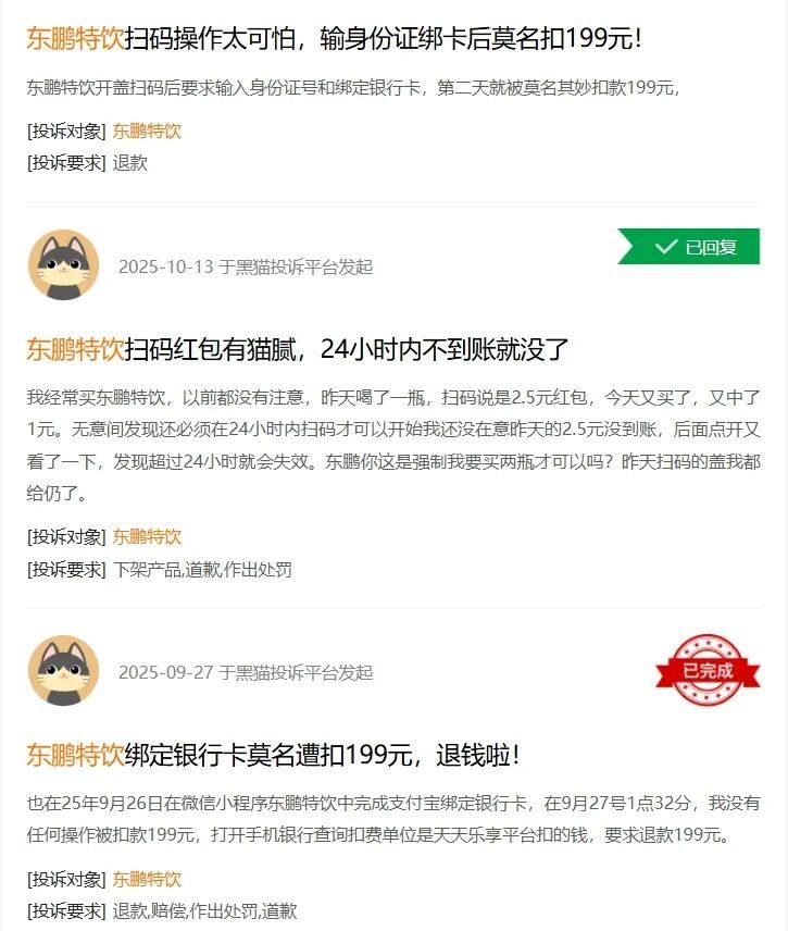 “趣解商业”注意到,“黑猫投诉”平台上也有不少类似关于扫码抽奖的投诉。2025年9月24日,有消费者投诉称,东鹏特饮开盖扫码后要求输入身份证号和绑定银行卡,第二天就被莫名其妙扣款199元。