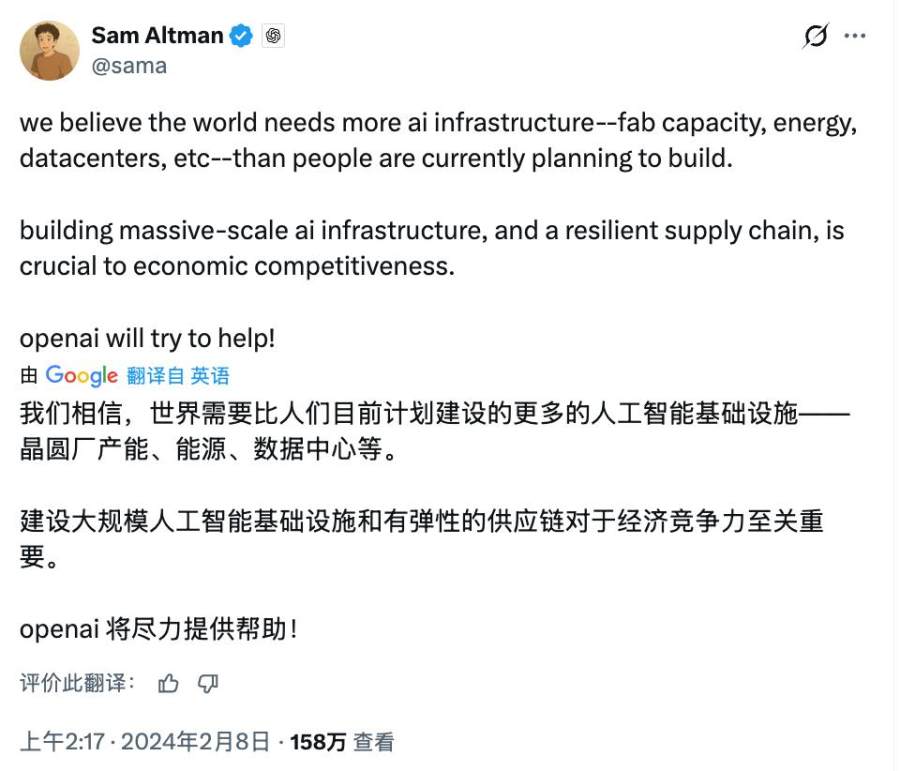 如果将时间拨回到去年2月,奥特曼的算力野心还宛若痴人说梦。彼时,他在X平台发帖大力提倡建设大规模人工智能基础设施,而多家媒体援引知情人士的消息称他正在向包括阿联酋政府在内的投资者洽谈,想要筹集最高7万亿美元。