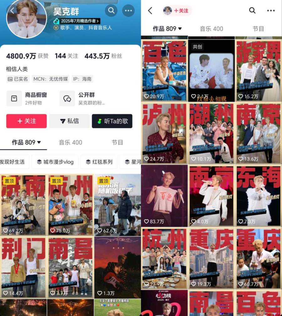 以其旗下艺人吴克群和头部达人豪哥哥为例。通过签约无忧,吴克群从歌手艺人的身份逐渐成长为“野生文旅推广大使”,借助在各地演出时发布的丰富城市特色短视频,与演出目的地构建深度链接,充分发挥明星艺人的影响力,带动地方文旅发展。而吴克群本人也借此收获了更丰富的人设标签和用户认可。