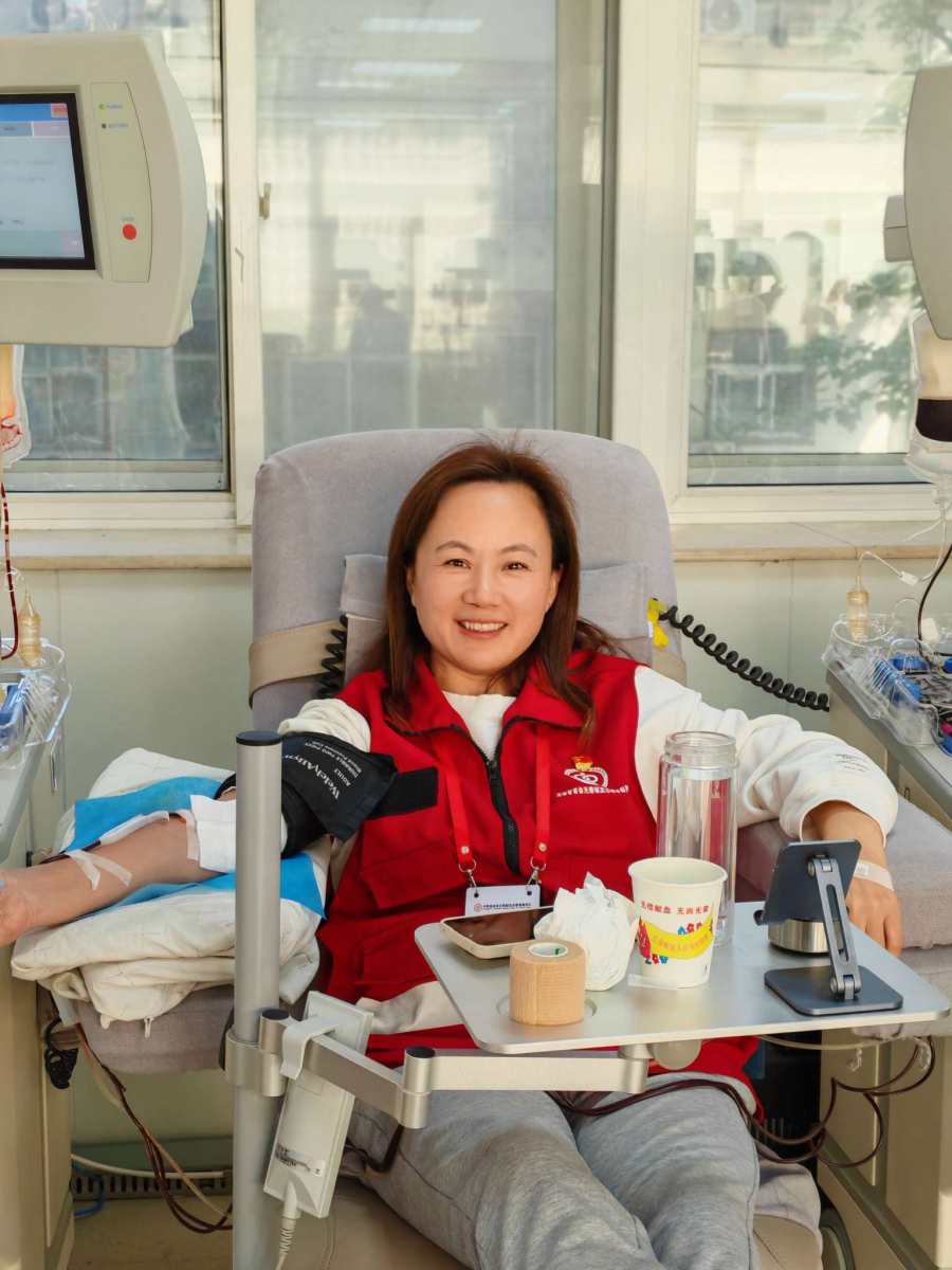 2025年11月1日是余霞老师的生日,也是她第一百次献血的日子,二十余年间,她累计无偿献血100次,其中全血12次3700毫升,机采血小板88次132个治疗量。当被问及坚持百次献血的动力,她坦言:"每次看到采血袋里流淌的红色,就会想象这可能是某位患者重生的希望"。这份"被需要"的感觉,是她坚持最恒久的动力。更让她欣慰的是,在她的感召下,她的爱人和朋友多人加入到无偿献血的队伍中。