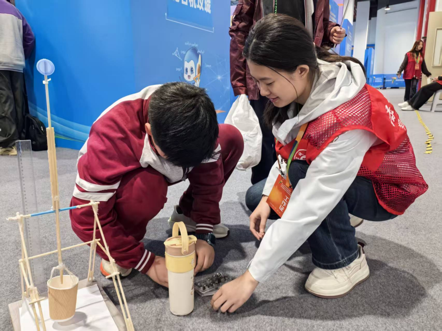 在活动现场,志愿者们各司其职,以高度的专注和严谨的态度投入工作,在各个岗位点亮志愿星火。在评比现场,他们穿梭于各展台之间,认真细致地向评委老师报送参赛作品的成绩,并迅速准确地完成分数统计,保障了比赛评比的公平和高效。此外志愿者们还主动化身“科学助教”,耐心解答着小选手们的疑问,协助他们调试了运用光学、力学、机械传动等原理的科技作品。志愿者们用热情的服务播撒科学的种子,用温暖的陪伴守护童真的笑脸,让科普教育在互动体验中焕发出新的活力。