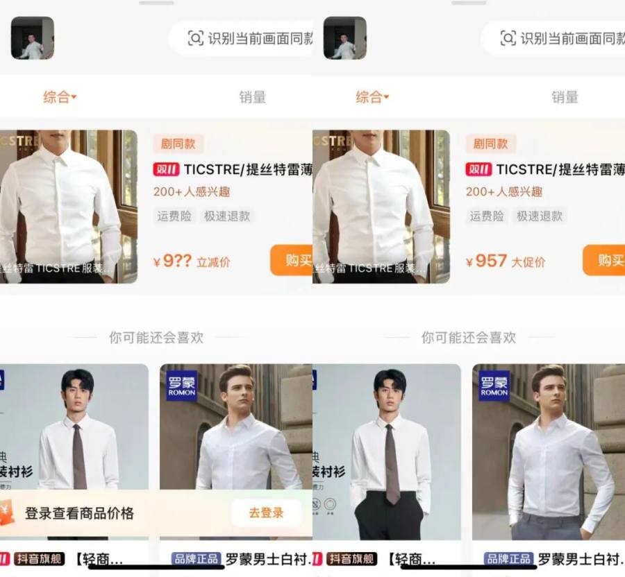 连线Insight在体验中发现一个细节,弹出的同款商品并没有直接展示价格,而是需要用户登录后才会显示价格。这意味着,抖音在有意促成更多用户从红果短剧向抖音商城转化。