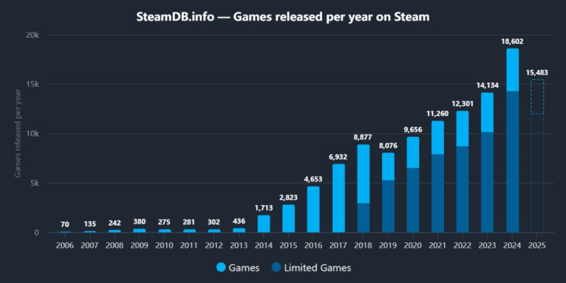 SteamDB的数据显示,2025年发布的1.3万款新游戏中,有40%的游戏收入不足100美元,连上架成本都无法收回,收入突破10万美元大关的仅约1000款。
