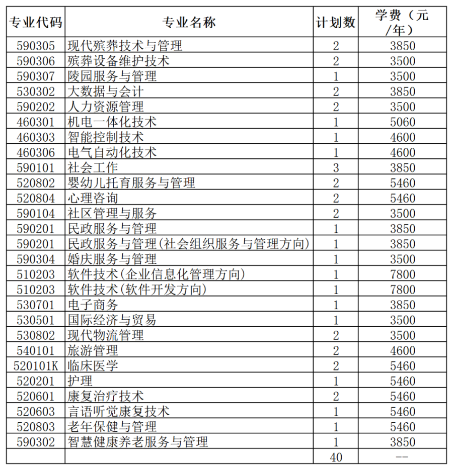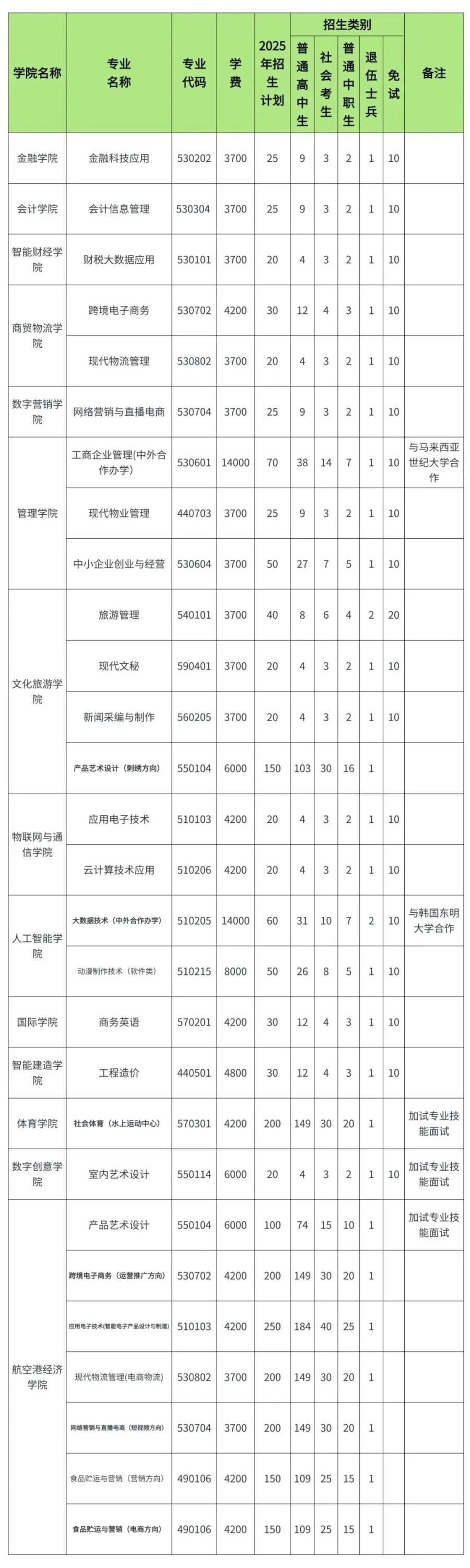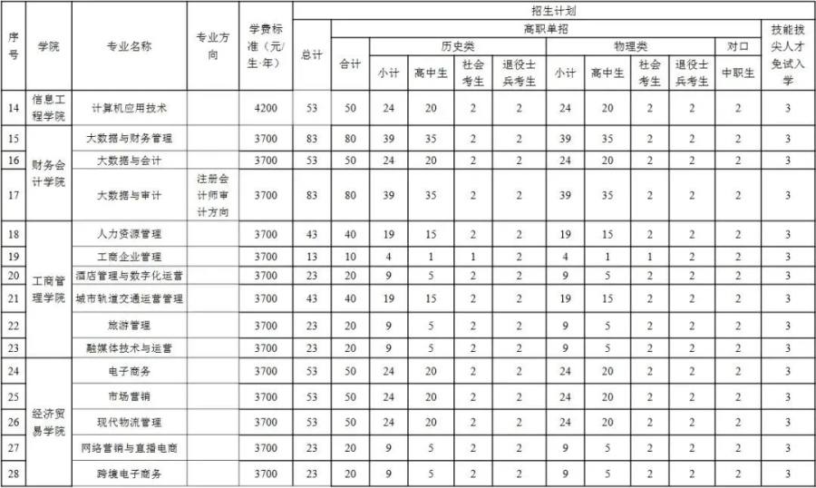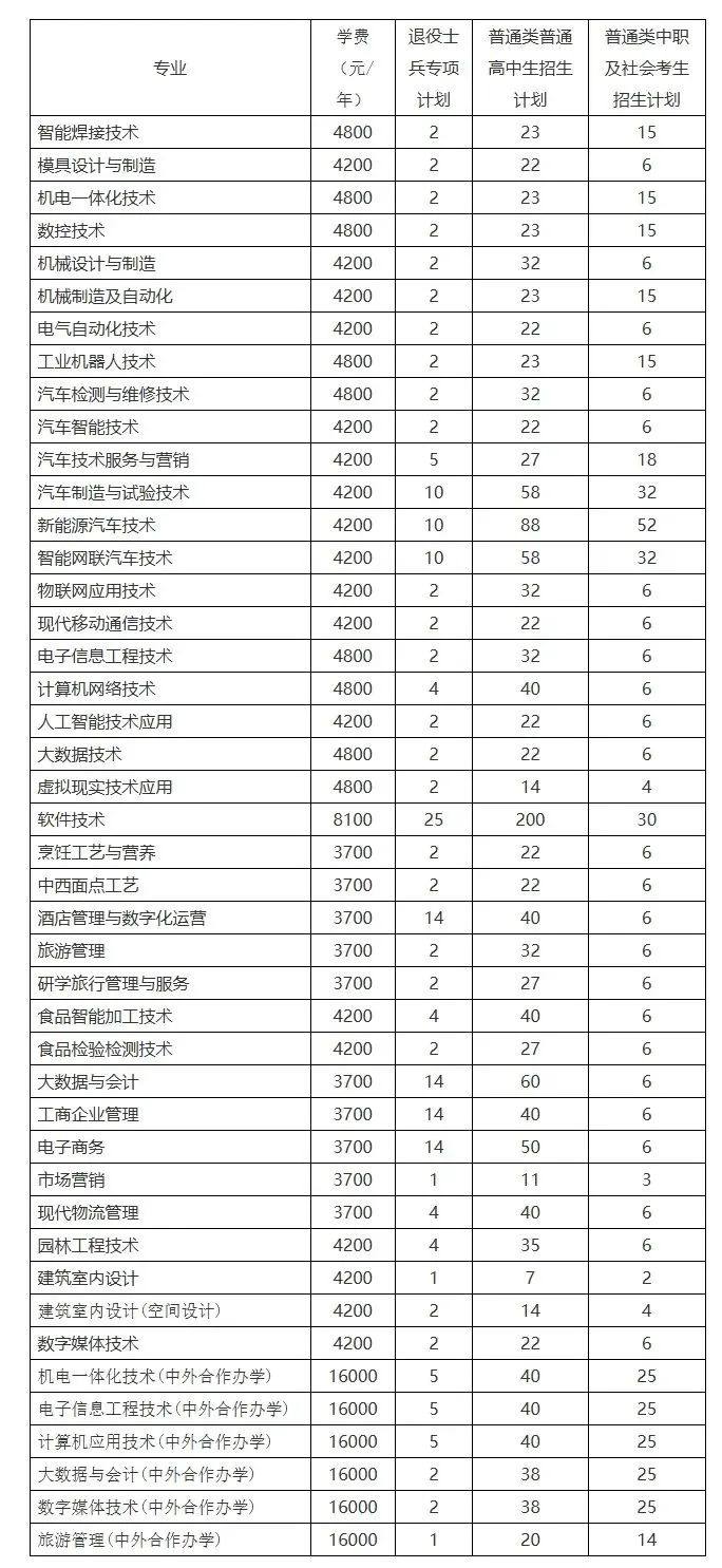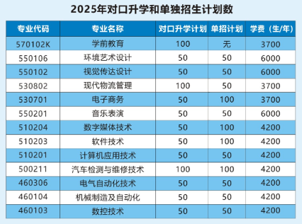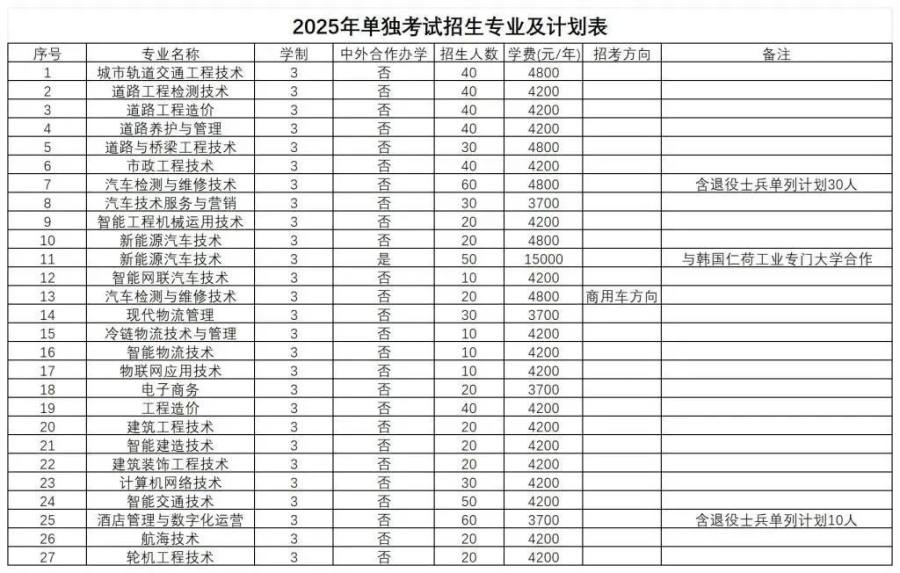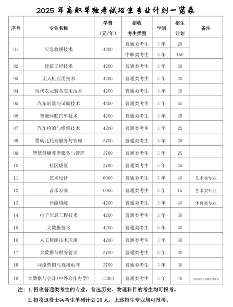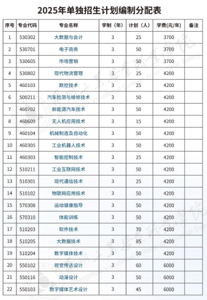 学校2025年单独考试招生计划为700人。其中普通类(含普通高中类、中职类、社会考生)招生计划650人,退役士兵单列计划50人。依据报考情况,学校可进行适当调整专业招生计划。