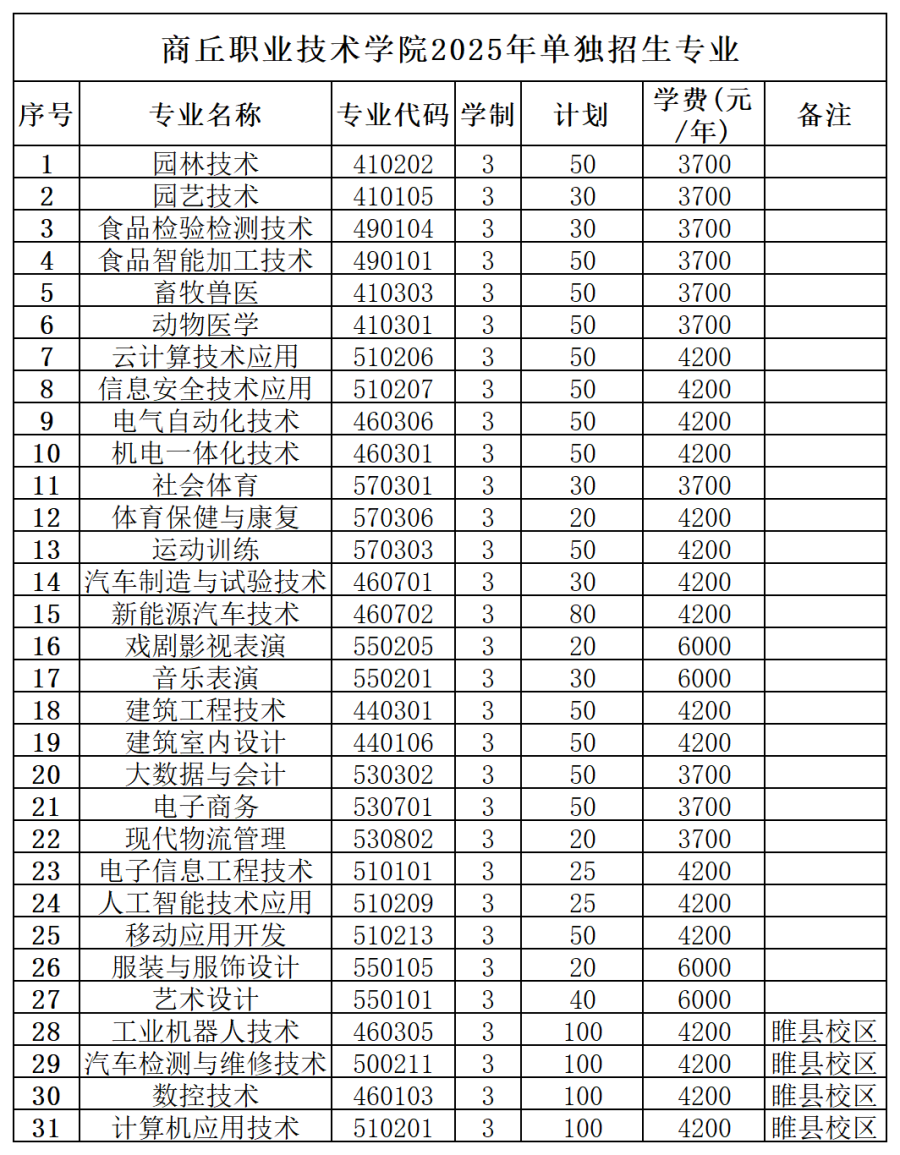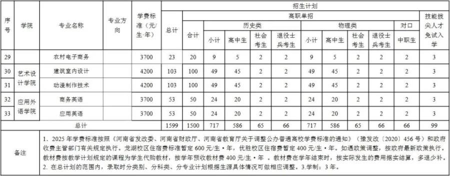 学校2025年单独考试招生计划2940人,其中商丘校区招生计划1700人,招生专业18个;开封校区招生计划1240人,招生专业12个。