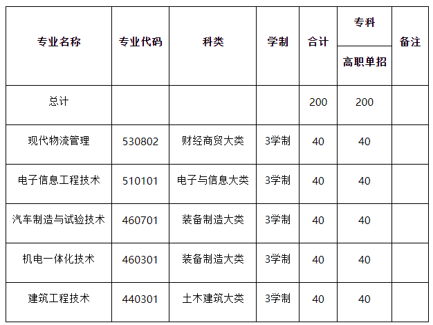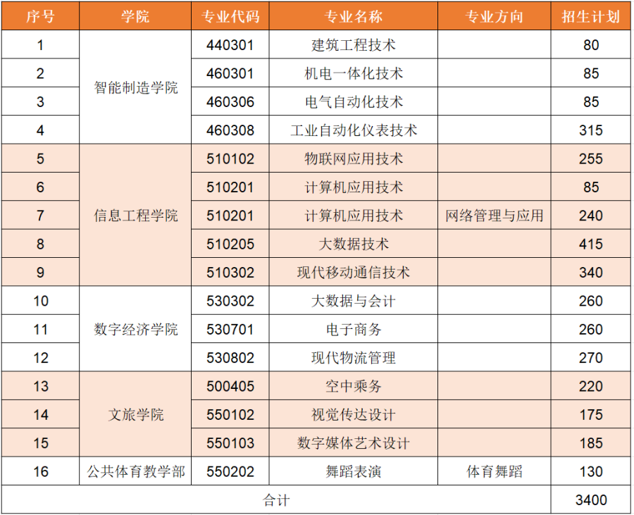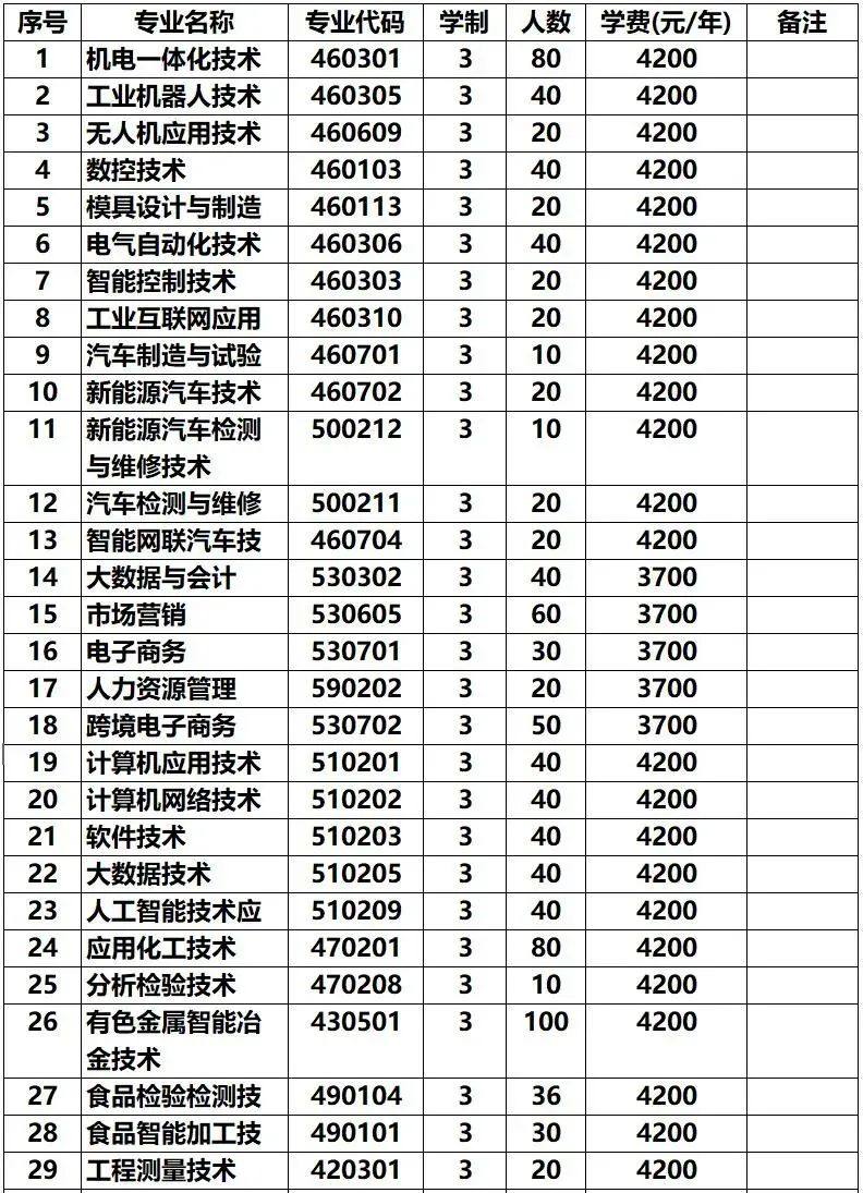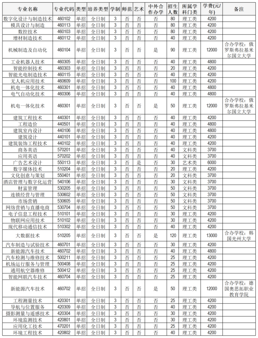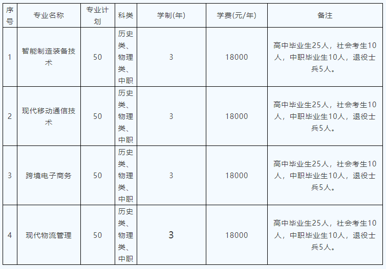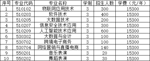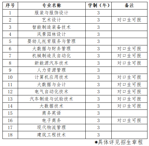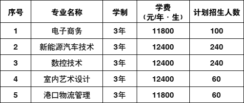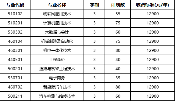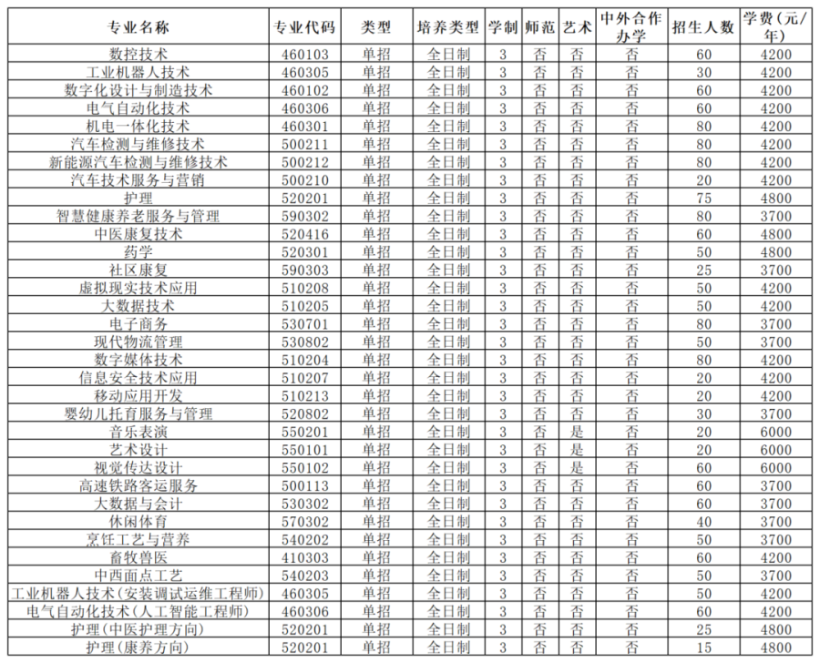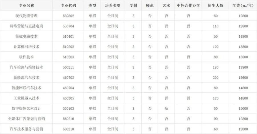 面向中职生考生招生的专业有:电力系统自动化技术(不招收色弱、色盲考生)、风力发电工程技术(不招收色弱、色盲考生)、机电一体化技术、物联网应用技术、现代物流管理等5个现代学徒制专业。