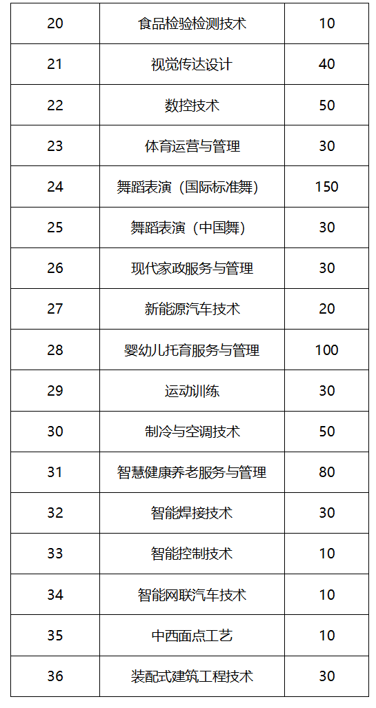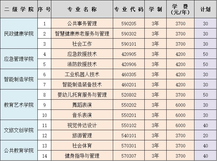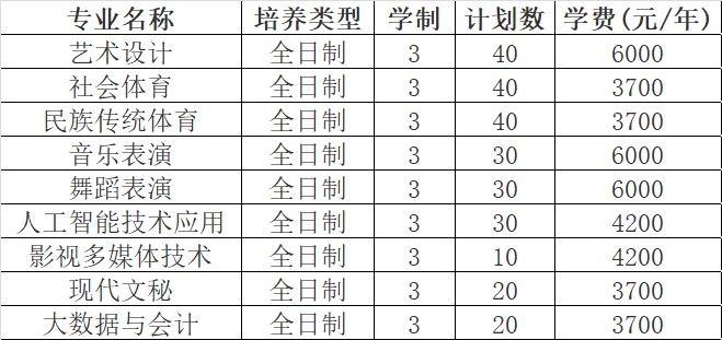 学校2025年高职单招计划100人:舞蹈表演专业计划60人、社会体育专业计划40人。