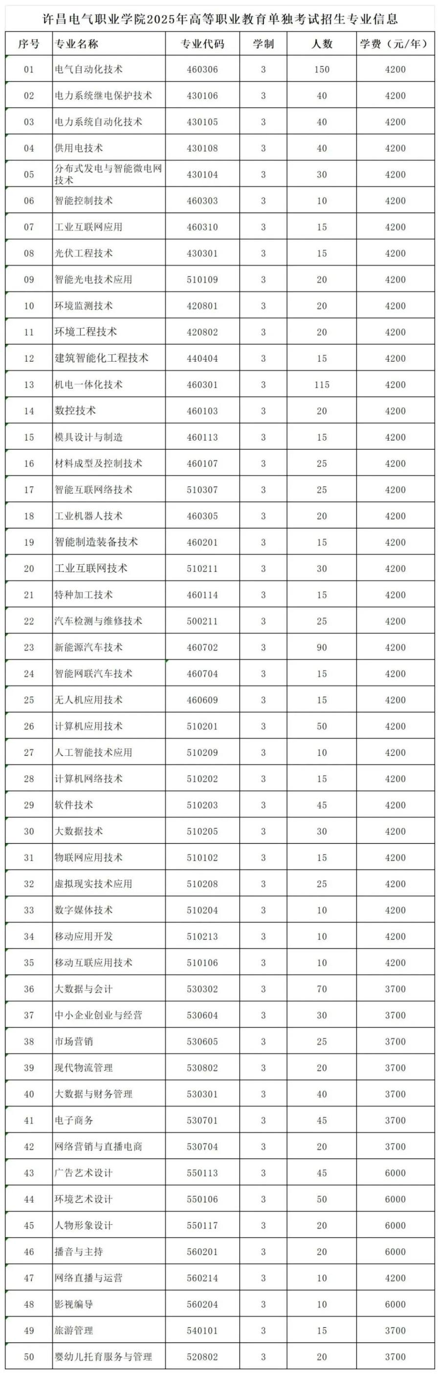 110、郑州电力职业技术学院学校2025年有发电厂及电力系统、电力系统自动化技术、电力系统继电保护技术、供用电技术等47个专业。面向河南省单独考试招生计划2300人。