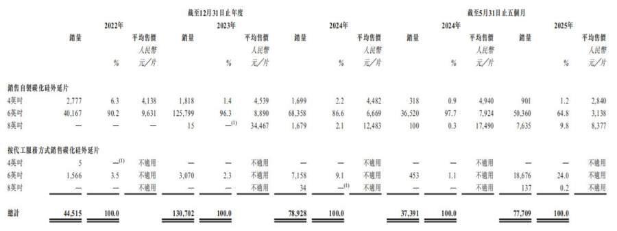 报告期内,该业务分别实现收入3.98亿元、11.27亿元、4.84亿元及2.25亿元,对总营收的贡献占比分别高达91.2%、96.2%、93.2%和87.4%。对比可见,2024年和2025年前五个月,其碳化硅外延片收入是下滑的,同比增速分别为-57.02%、-23.28%。