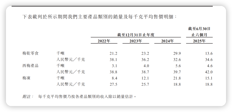 近年间,溜溜果园的业绩增长很大程度上源于“以价换量”。其两大核心产品均价显著下调:梅干零食从38.1元/千克降至32.6元/千克,梅冻产品则由27.5元/千克降至18.8元/千克。