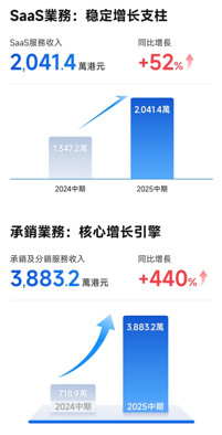 一方面,公司行情交易一体化终端产品及服务收入保持稳定发展,公司SaaS平台已经服务了近200家券商客户,生态渗透持续深化。其中SaaS业务作为稳定支柱,实现收入2,041.4万港元,同比增长52%。
