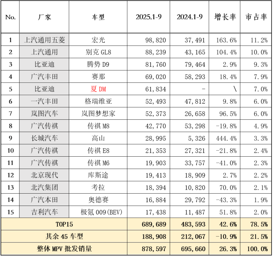 ▲图:国内MPV2025年前三季度TOP15销量、增速及市占率(源自乘联分会)