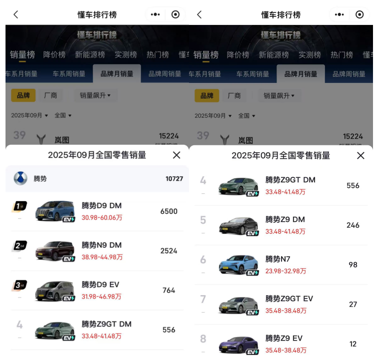 据懂车排行榜显示,2025年9月,腾势Z9GT DM销量为556辆,Z9 DM为246辆,纯电版本Z9GT EV和Z9 EV分别为27辆和12辆,而中型SUV N7在当月交付98辆。而据腾势官方数据,2025年9月,腾势品牌全国零售销量达到12407辆。