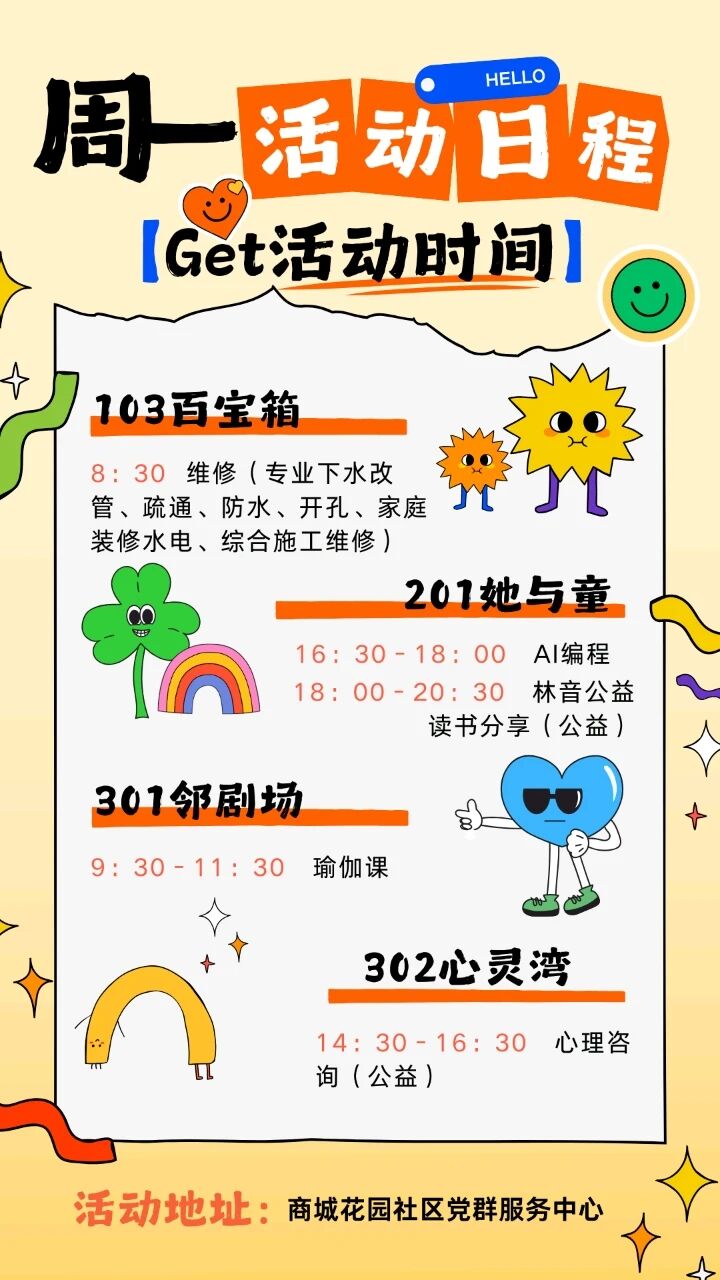 除此之外,公众号智享花园每周还为居民提前预报本周开展的各类活动,无论是邻剧场的瑜伽课、她与童的AI编程,还是乐龄社的成人书法、会客厅的科普学堂,各类文娱活动应有尽有。“社区合伙人”们群策群力、精心策划,不断丰富活动内容,满足居民多样化的精神文化需求,持续提升居民群众幸福感与归属感,为基层治理注入活力。