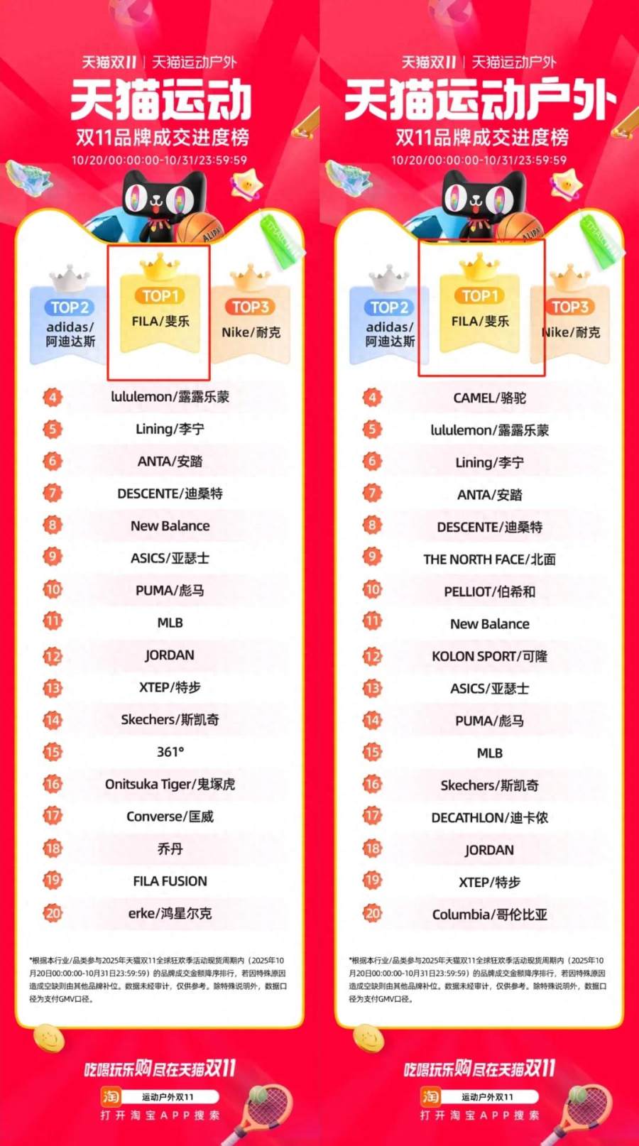 截至双11第一阶段结束,FILA稳坐双榜第一