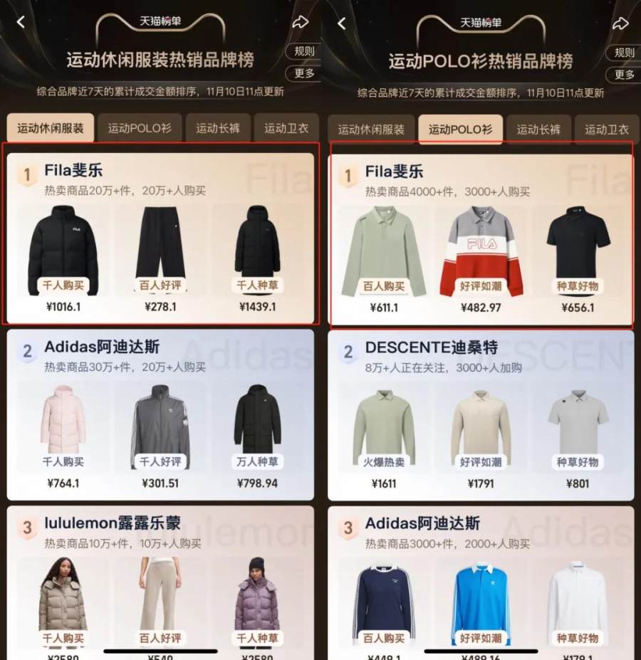天猫双11必买榜,FILA火星2位列运动品类(包含鞋服)第二