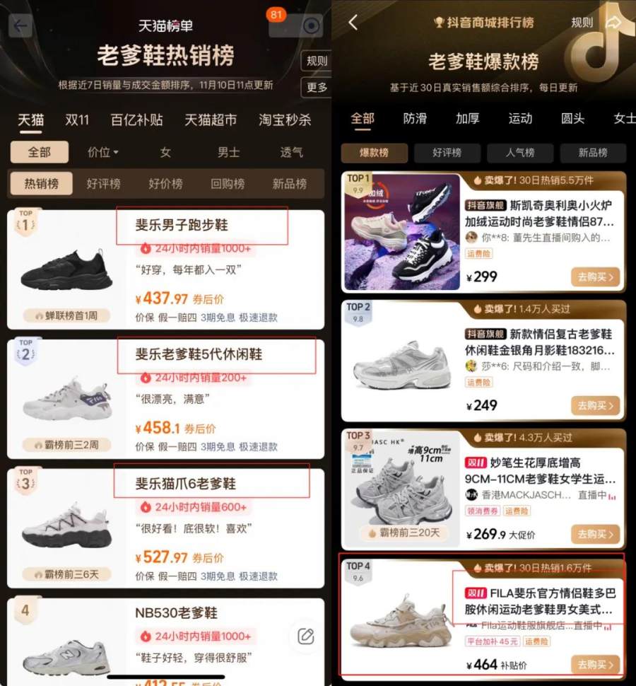 天猫老爹鞋榜单vs抖音老爹鞋榜单