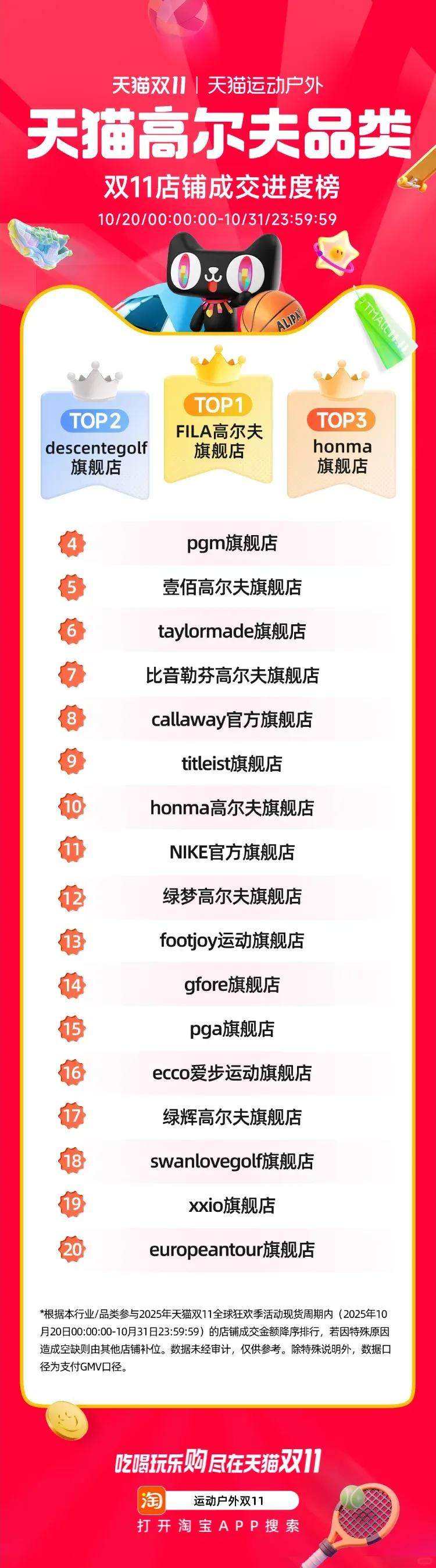 双十一第一阶段,FILA高尔夫旗舰店销量位居类目第一