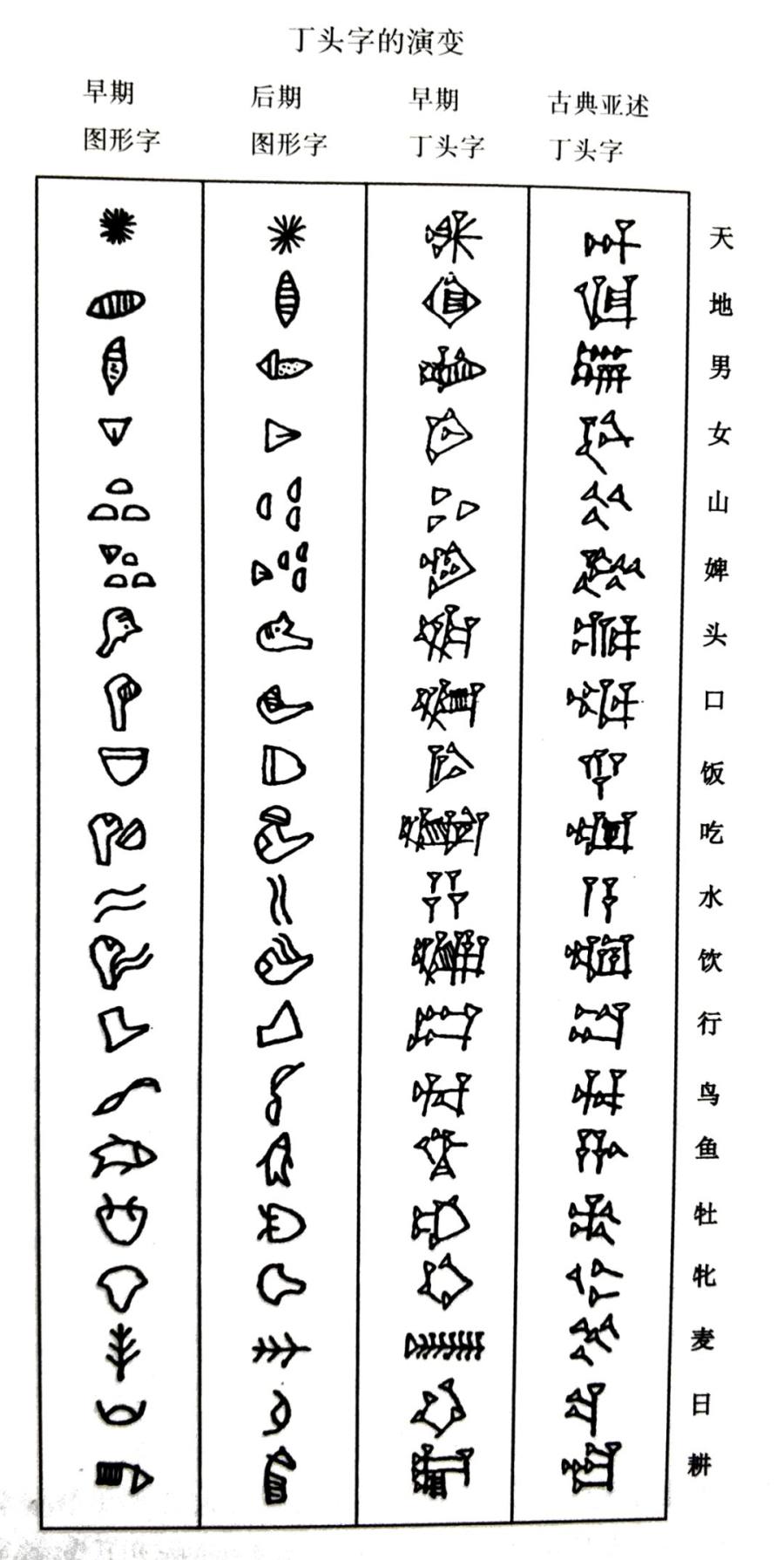 由此可见,无论“圣书字”还是“丁头字”,都跟先民的生产生活相关。“圣书字”繁复的象形字、“丁头字”书写带来的深浅笔画,至今仍可想象,这类古文字内在结构当然跟汉字“六书”相通,但它们更多是比如世界的形象而来,或是因材制宜而呈现自己的特征。