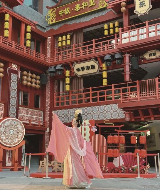陇海路旁的中铁•泰和里,藏着最鲜活的“唐宋梦华”。诗词幕布引路,酒旗招展,非遗市集里剪纸、捏面人、漆扇手作一应俱全,瞬间拉满市井氛围。