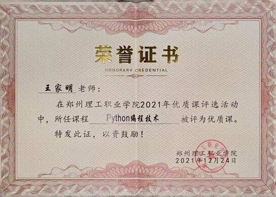 荣誉是对王家明教学成果与专业追求的最好诠释。自2022年起,他连续多年在河南省高等职业教育技能大赛中荣获佳绩,2次荣获物联网技术应用赛项三等奖优秀指导教师称号。2025年,他更是指导学生荣获第十一届河南省大学生机器人竞赛机器人走迷宫赛二等奖,以及第十六届蓝桥杯全国软件和信息技术专业人才大赛河南赛区单片机设计与开发职业院校组三等奖,展现了其突出的指导能力与学生培养成果。此外,他还2次被评为校级优秀教师,所担任的《Python编程技术》课程2次被评为校级优质课,这些荣誉不仅是对他个人能力的认可,更是对他教学热情的肯定。