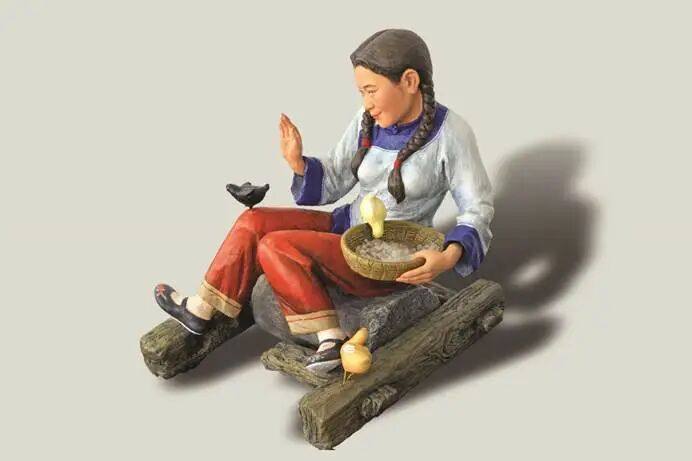 这时候,还有一只黄色的小鸡已经飞到箩筐的边沿,吃掉一些“米粒”,但村姑却全然不知……