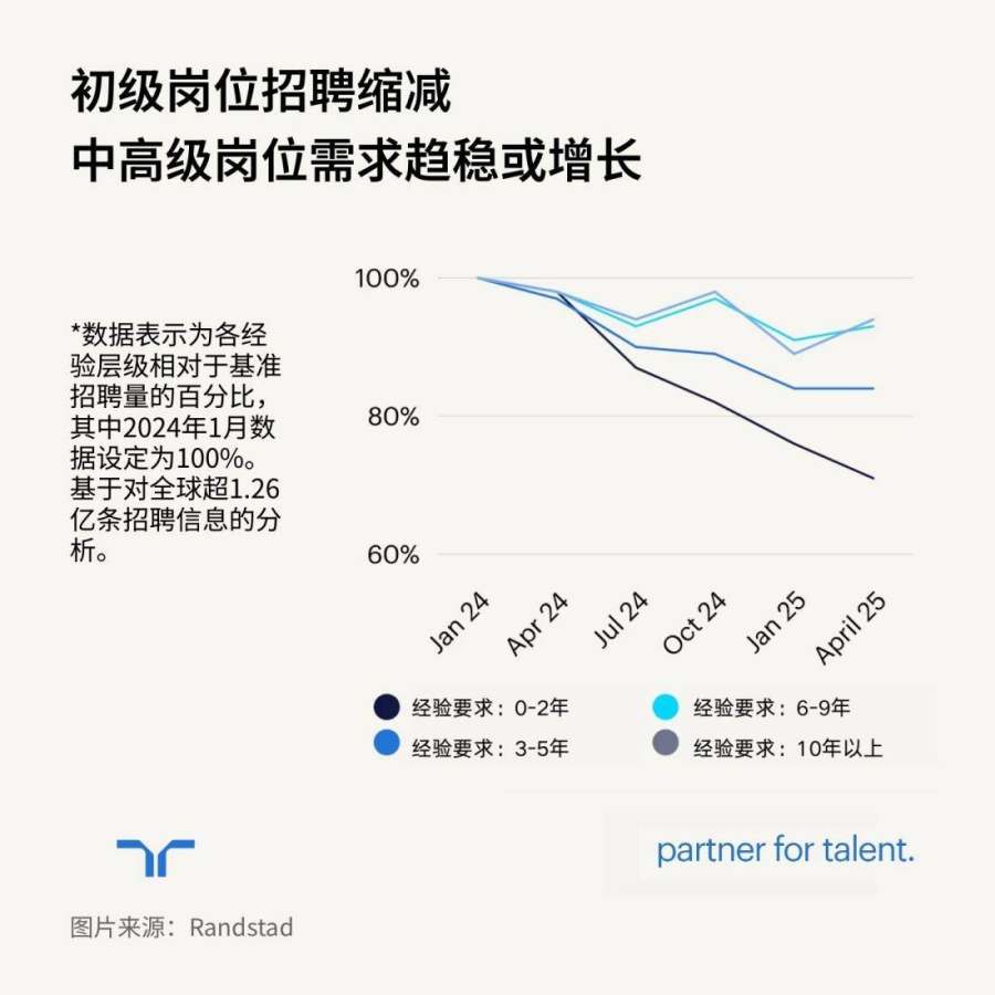 “任仕达”调研全球1.26亿份招聘数据显示,自2024年1月以来,全球初级职位招聘量已下滑29个百分点。超过半数(54%)的Z世代正在积极求职,仅有11%计划长期留任现有岗位。