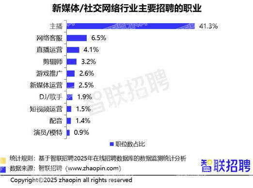 到2025年,直播行业仍然是大学生就业承接“大盘”。智联招聘发布《2025年三季度人才市场热点快报》显示,新媒体/社交网络行业三季度招聘职位数同比增长8.9%。从招聘职业看,主播以41.3%的职位数占比位居首位。