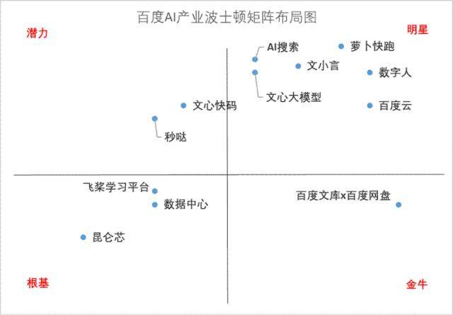 如果我们如以“波士顿增长矩阵”为逻辑,勾勒百度的“大模型生态雨林的涌向效果”,则可一图胜千言般一目了然: