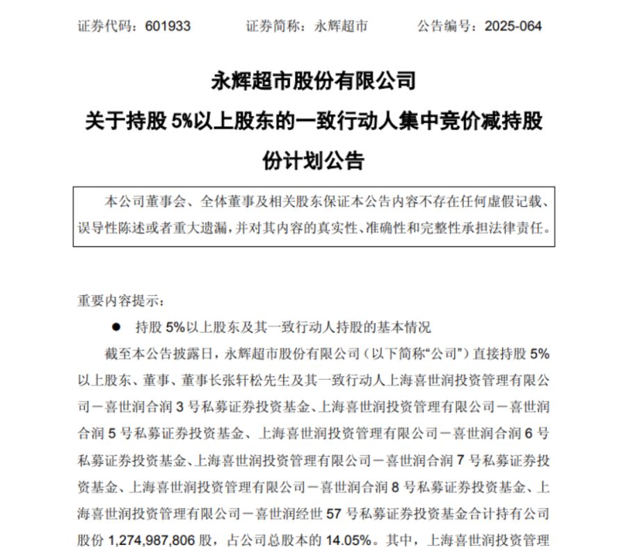 此次减持由张轩松的一致行动人“喜世润合润6号基金”执行,该基金目前持有永辉超市近1.7亿股,若顶格减持,其手中53%的股份将被清空。公告显示,减持将于12月4日起启动,持续至2026年3月3日,价格将视市场情况确定。
