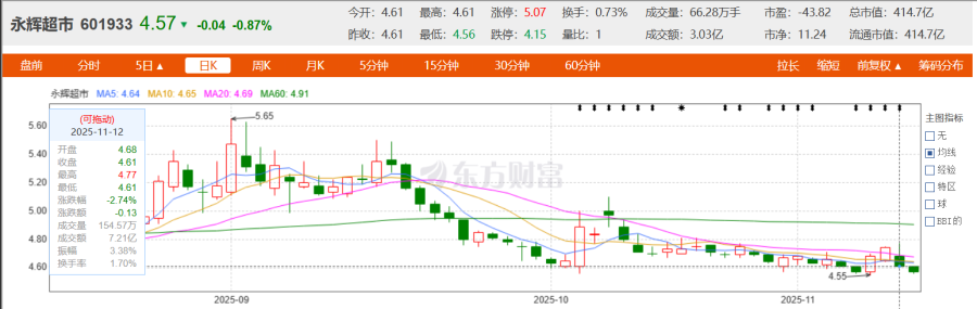 减持计划发布次日,永辉超市股价应声下跌2.74%,以4.61元/股收盘,最新市值缩水至418亿元。