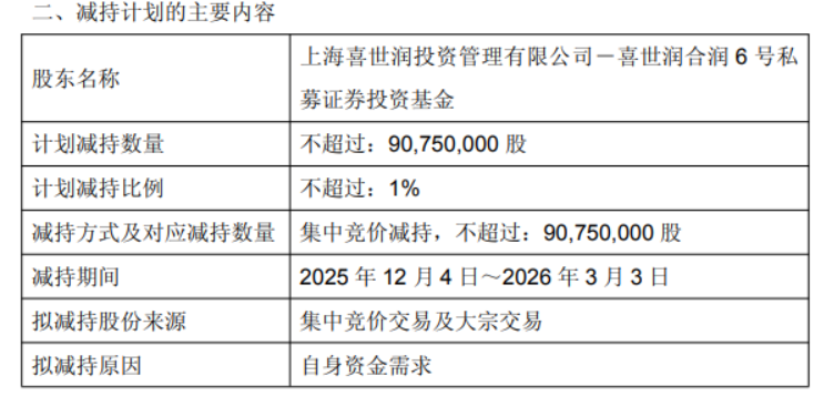 11月11日晚,永辉超市公告称,该公司近日收到董事长张轩松及其一致行动人出具的《股份减持计划告知函》 ,因自身资金需求拟通过集中竞价交易方式减持公司股份合计不超过9075万股,即不超过公司总股本的1%。减持价格视市场情况确定。减持期间为2025年12月4日-2026年3月3日。