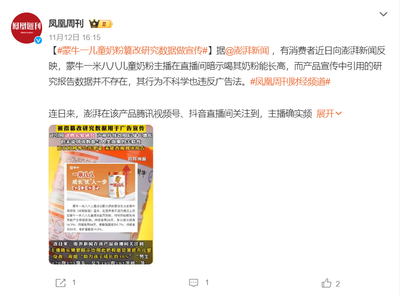 近日,据媒体报道,蒙牛一米八八儿童奶粉主播在直播间暗示喝其奶粉能长高,而产品宣传中引用的研究报告数据并不存在,其行为不科学也违反广告法。
