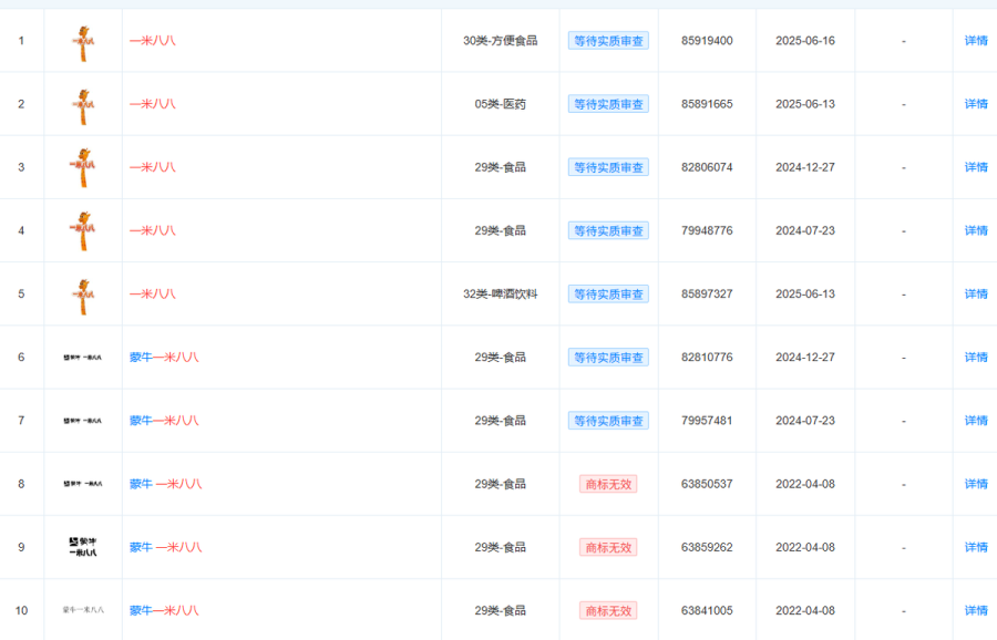 天眼查显示,2022年到2025年,蒙牛已申请多个“一米八八”、“蒙牛一米八八”等相关商标,分类包括方便食品、医药、啤酒饮料等。其中部分商标处于等待实质审查状态,有三个商标显示无效状态。
