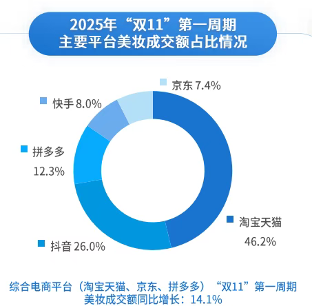 根据易观双11观察报告,今年双11第一周期主要平台美妆成交额占比为淘天46.2%、抖音26%、拼多多23.3%、快手和京东则平分剩余份额。