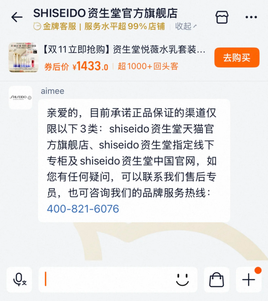 大学生胡越表示,现在很多大主播直播间都有相应的专属套装,自己买的国际品牌资生堂不敢保证真假特地问了淘宝客服,对方回应称正品渠道仅保证天猫旗舰店、线下专柜和官网,在对比各大平台后,她还是选择在天猫官旗店拍下这套水乳,心里感觉有保障些。