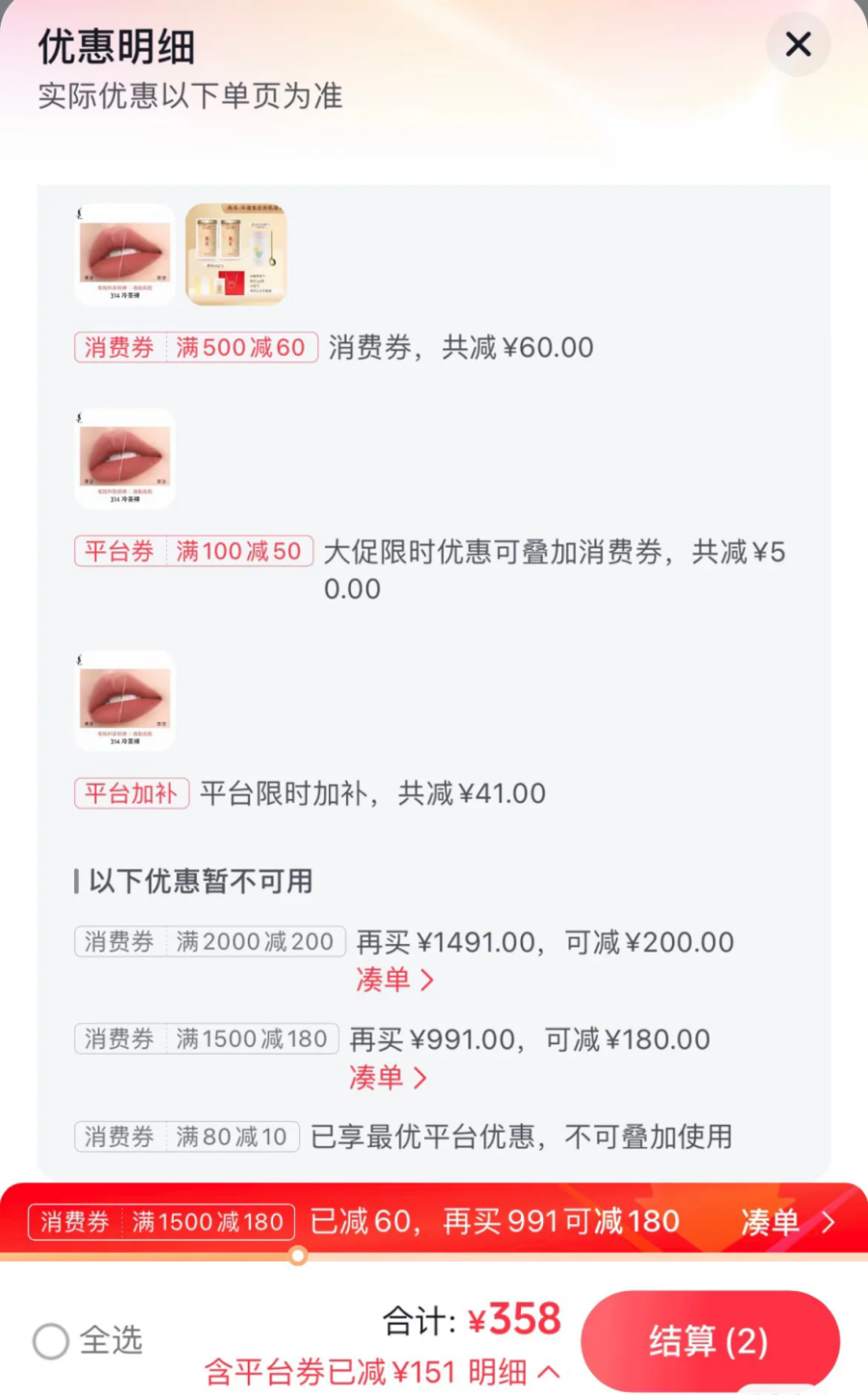 付虹以前每次在天猫上花100元多买初尹的A醇精华,双11期间抖音商城发了很多6折券,不用凑单67.8元就能买到。“现在只要进达人直播间就会给平台减41元的补贴,然后抖音商城里会随机刷80-10、500-60、1500-100的各种消费券,最高可以凑2000-200元,这种非大牌产品在抖音上价格还是很香的。”