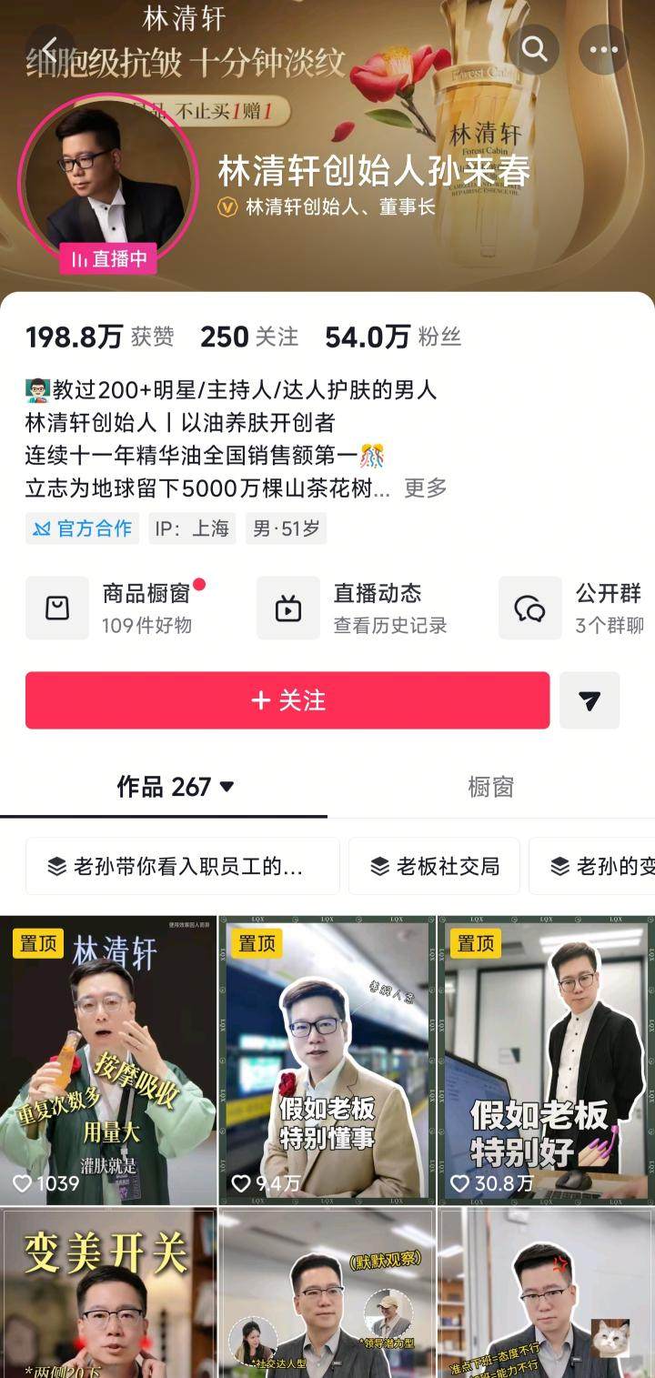 林清轩则另辟蹊径,以创始人IP为核心驱动品牌破圈。创始人孙来春亲自入驻抖音,开设账号「林清轩创始人孙来春」,不仅高频次直播带货,在双11期间贡献了1000万至2500万元的销售额,还持续发布短视频内容引流。