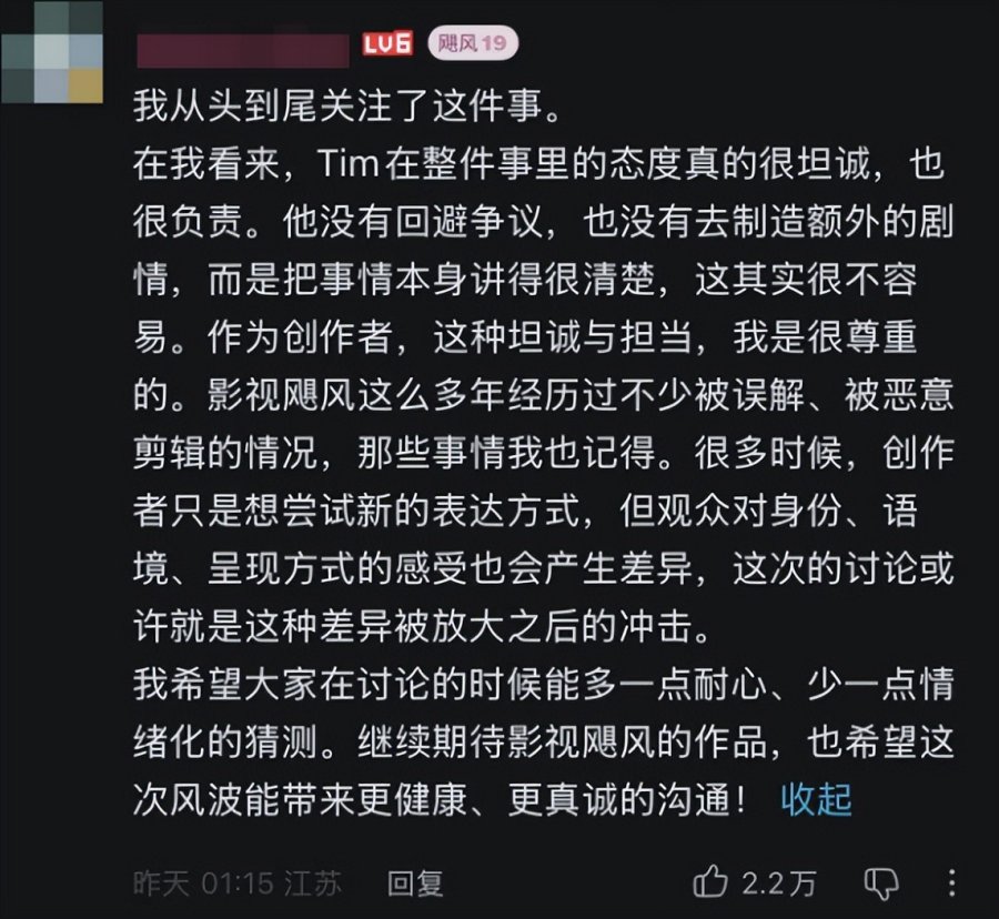 但颇为有趣的是,在主流的舆论之外,还存在着另一种截然相反的认知。是的,如果你打开影视飓风针对这次事件发布的 B 站回应视频,会发现不少人对这场风暴的起因感到不解,对极端解读更是持反对意见。