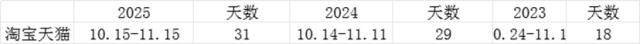 以淘宝天猫(下称淘天)为例:三年间,不算返场时间,双十一大促总时长从18天拉长到了31天,从双十一大促节,悄然变成了双十一大促月。